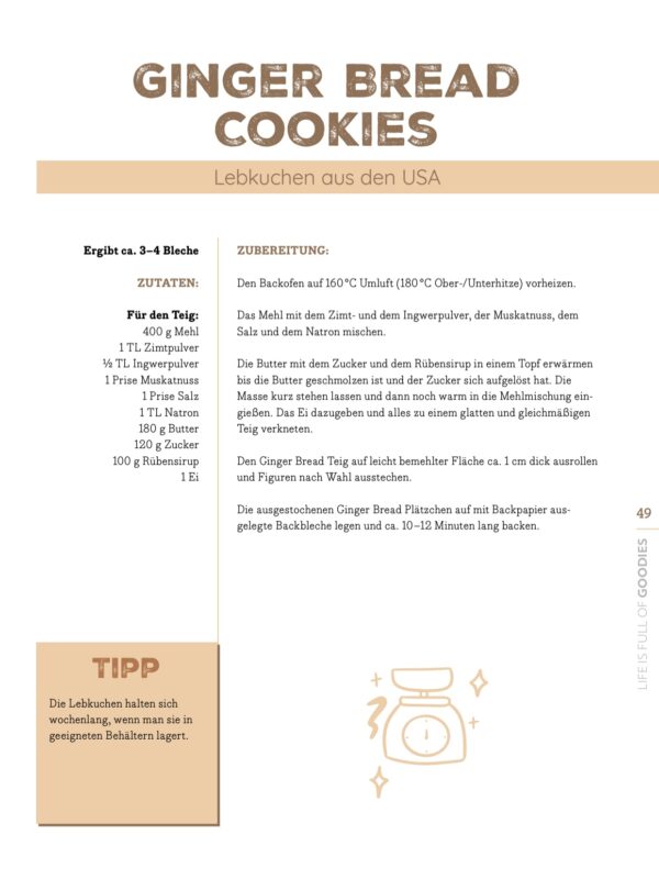 Zudem bietet das Buch 12 zusätzliche und noch freie Rezeptseiten, um deine eigenen Lieblingsrezepte, die du schon hast oder die sich in den nächsten Jahren womöglich hinzugesellen werden, zu ergänzen. So wird jedes Buch zum Unikat und zum ganz persönlichen „MEIN Plätzchenbuch international“.