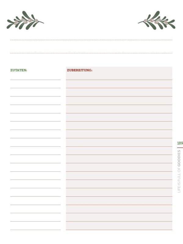 Da das Ebook als PDF Datei zur Verfügung gestellt wird, kann es bei Bedarf auch problemlos ausgedruckt werden. Damit jeder das Ebook zu seinem ganz persönlichen Plätzchenbuch transformieren kann, finden sich darin 12 zusätzliche freie Rezeptseiten, die die Möglichkeit bieten, seine ganz eigenen und individuellen liebsten Plätzchenrezepte zu ergänzen. Dadurch wird jedes ausgedruckte Ebook zu einem Unikat, das kein Zweiter auf der Welt haben wird. Ein ganz persönliches „MEIN Plätzchenbuch“ eben.